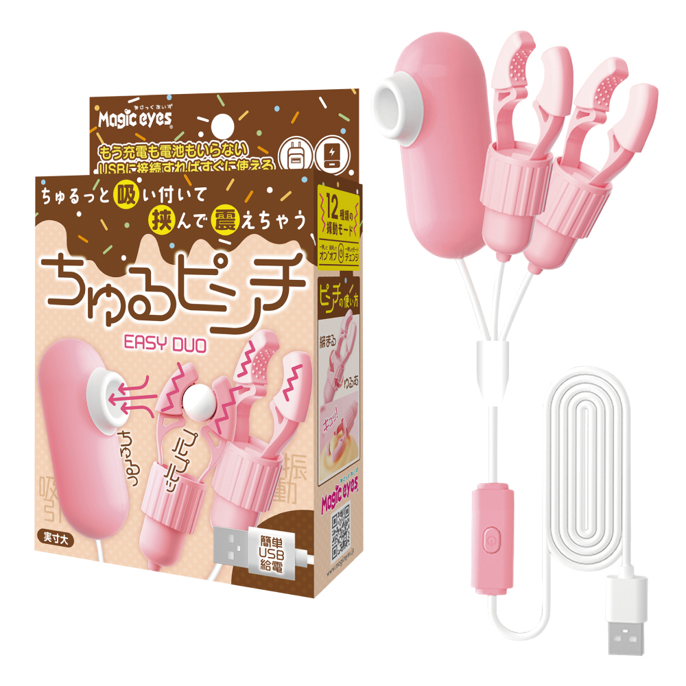 USB給電式の吸引&ニップルローターです♪挟む力を回して調整でき、吸引とピンチを同時に楽しめるダブルタイプです!12種類の振動モードを搭載し、ピンチ部分と吸引部にはシリコンカバーが付いているため、優しく包み込むような感触を提供♪本体重量76gと超軽量で、上下同時に使用しても快適です!モバイルバッテリーやUSBアダプターから給電でき、使用場所を選ばず楽しめる便利なアイテムです♪