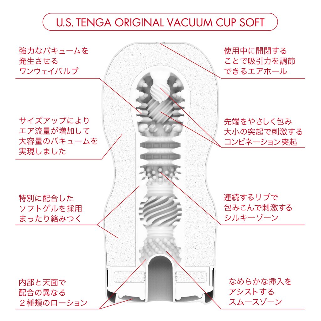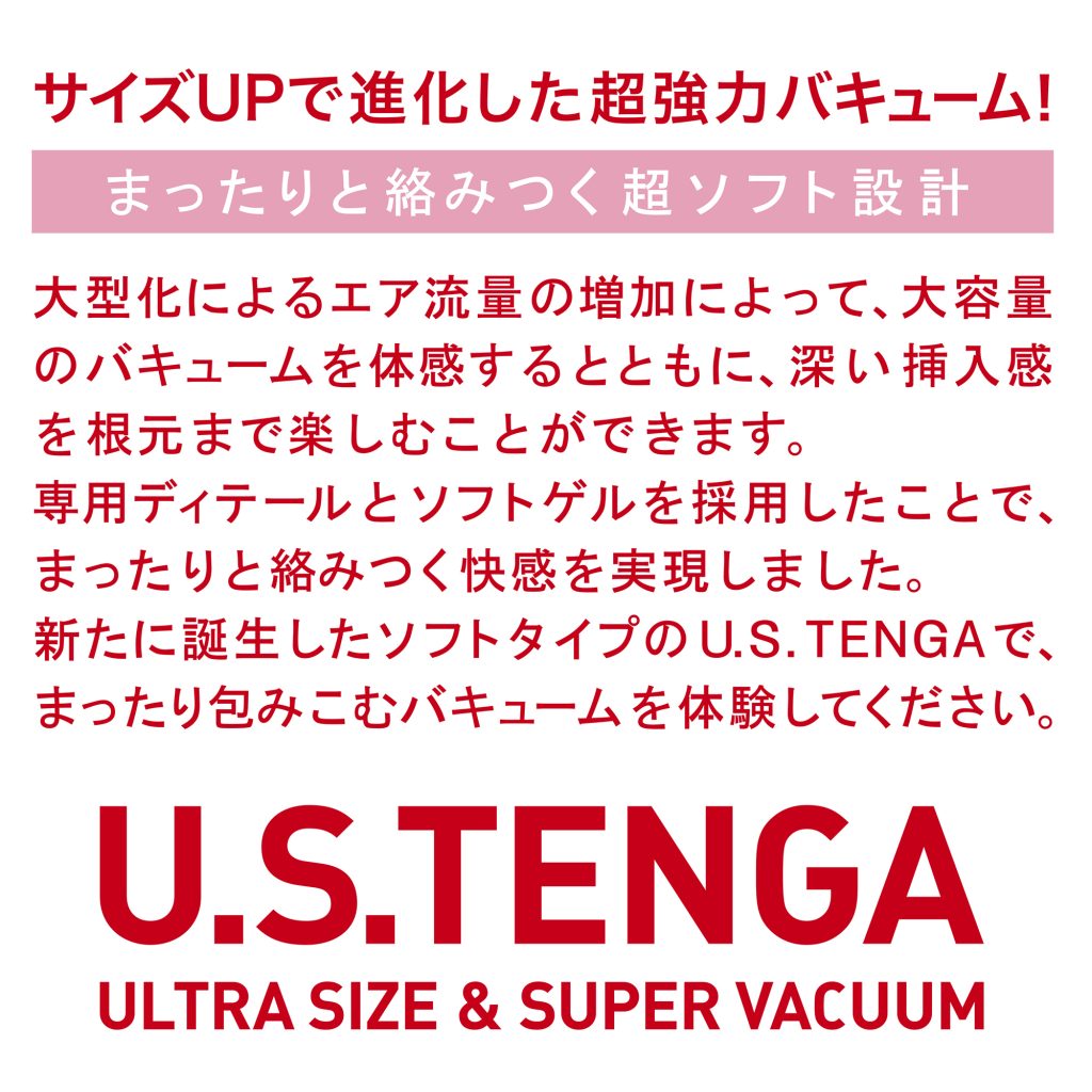 ゆったりとした挿入感と強めのバキュームが特徴の「US TENGA」がリニューアルして登場!ノーマルサイズのテンガより約1.6倍の体積に設計されているので違いがハッキリわかります♪3種類のラインナップに完全リニューアル!こちらのソフトタイプはつぶイボ壁にトルネード状のヒダ壁、くびれ箇所には粒イボと穏やかながらもバキュームにマッチした心地よい刺激が味わえます。